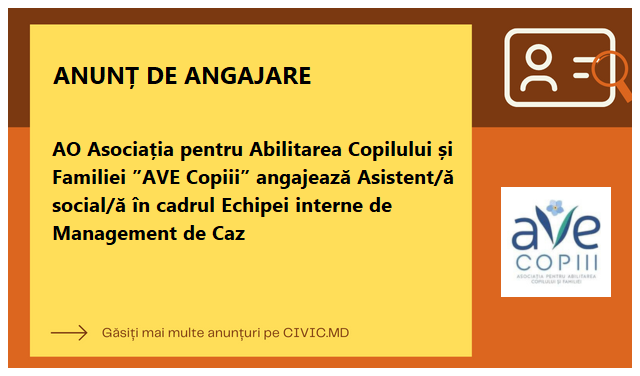AO Asociația pentru Abilitarea Copilului și Familiei ”AVE Copiii” angajează Asistent/ă social/ă în cadrul Echipei interne de Management de Caz
