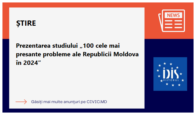 Echipa IDIS „Viitorul”, în parteneriat cu Fundația „Friedrich Ebert” Moldova, a realizat studiul „100 cele mai presante probleme ale Republicii Moldova în 2024”, care identifică principalele provocări cu care se confruntă țara — de la exodul populației, sărăcie și deficitul forței de muncă, până la criza de mediu, vulnerabilitățile de securitate și cele ale mediului de afaceri.